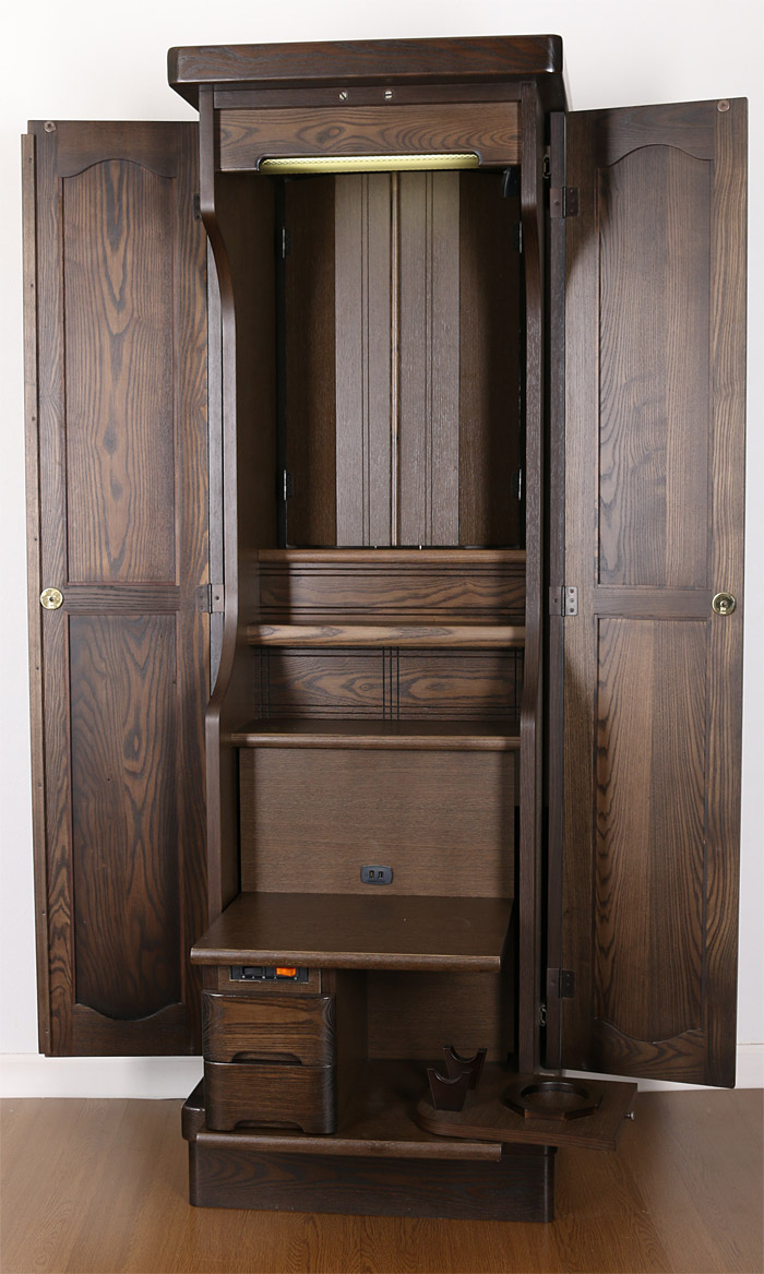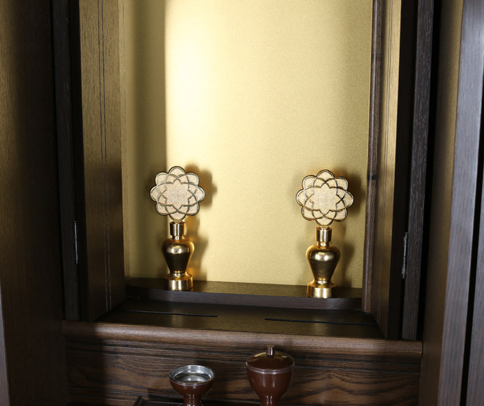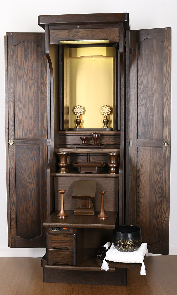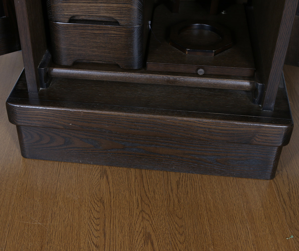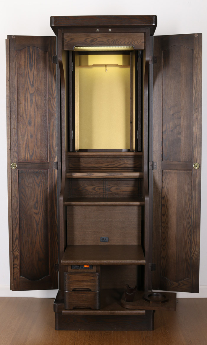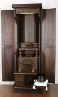 | 仕様 | ●本体寸法:高155×横幅50×奥行き44/cm ●厨子寸法:高さ51×横幅33/cm ●経 机 :幅38.5×奥行き29/cm ●外扉最大開幅:~102.5/cm ●経机引出し時の奥行き:63/cm |