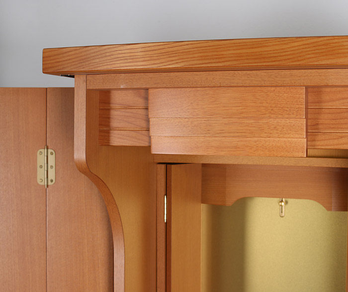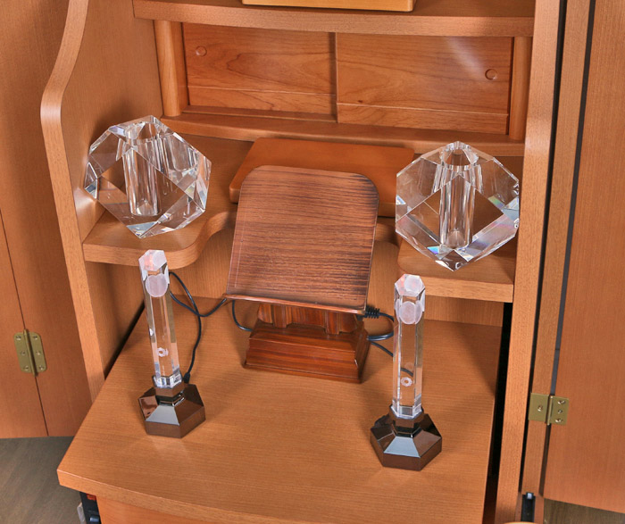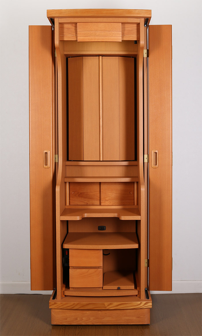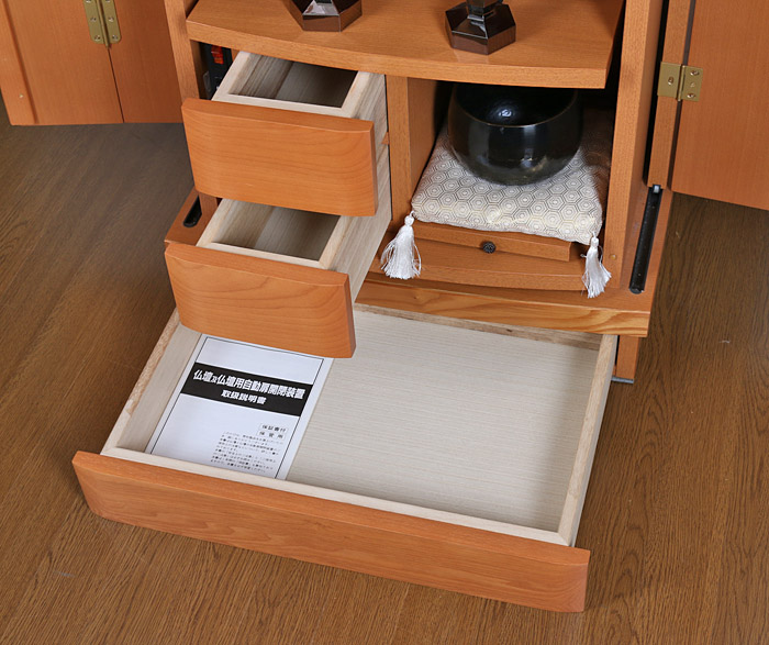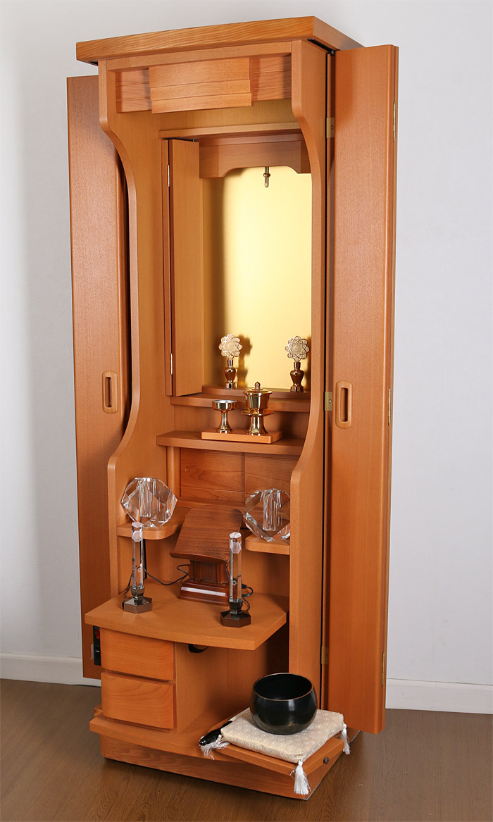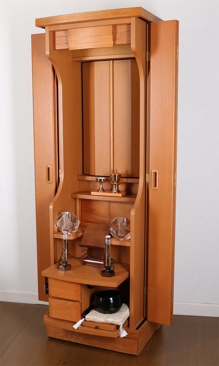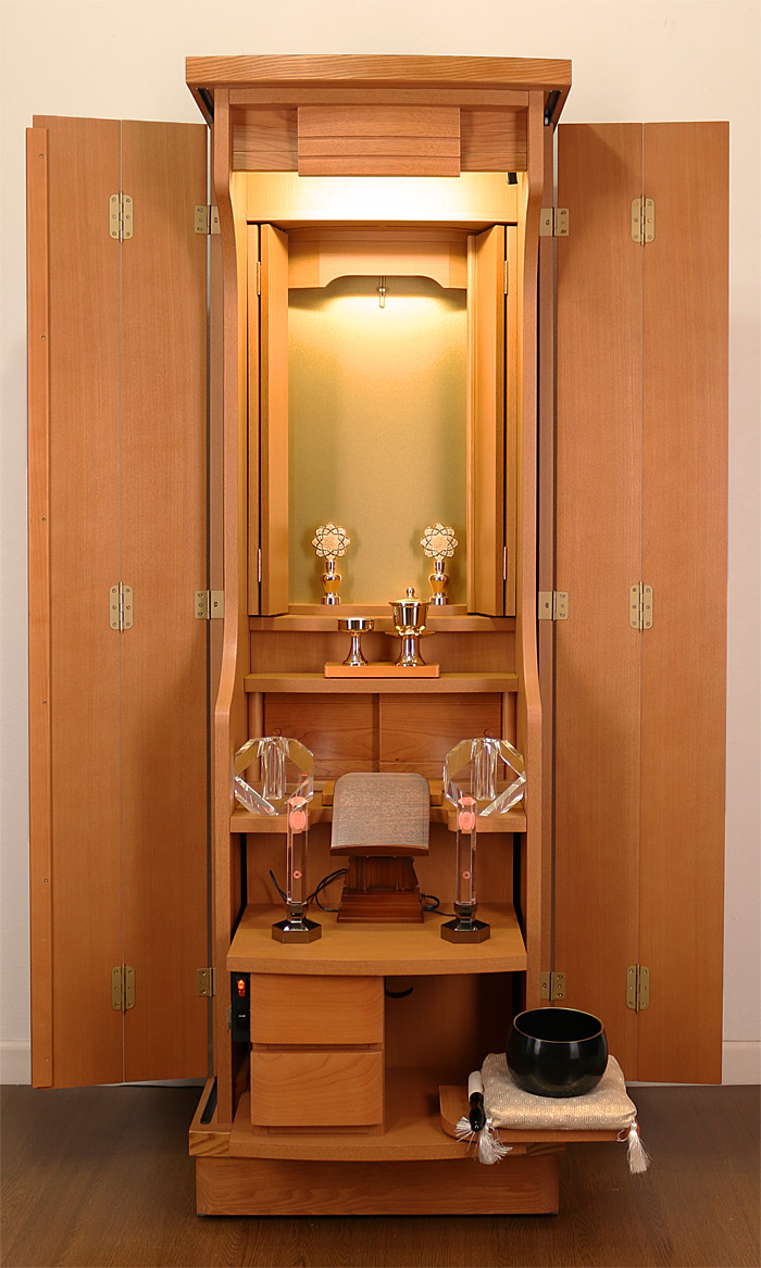 | 仕様 | ●本体寸法:高156×横幅51×奥行き43/cm ●厨子寸法:高さ54×横幅33/cm ●経 机 :幅38×奥行き29/cm ●外扉最大開幅:75~101/cm |