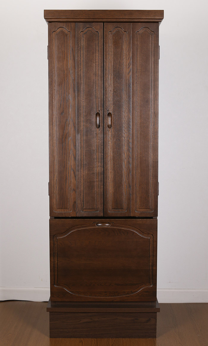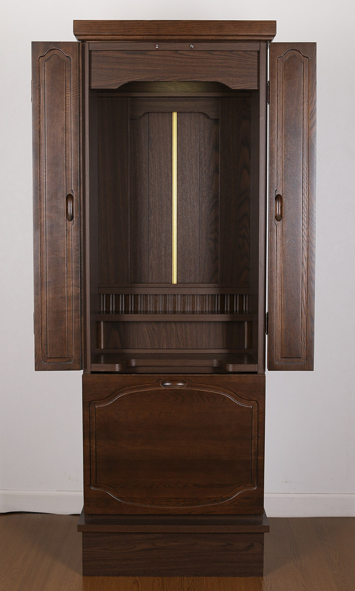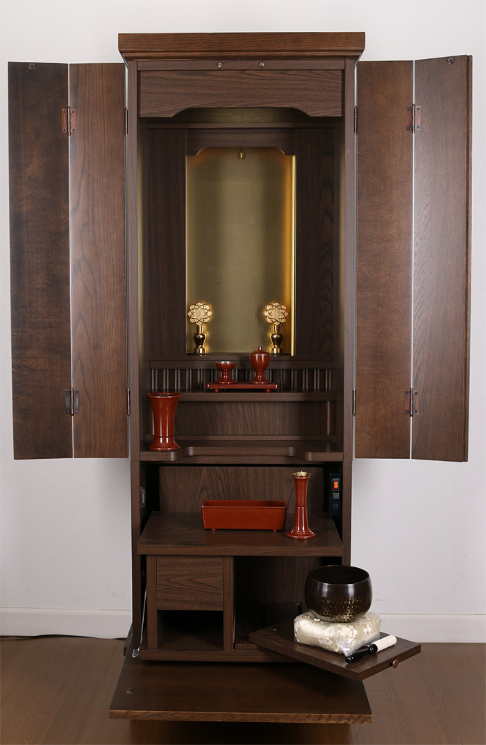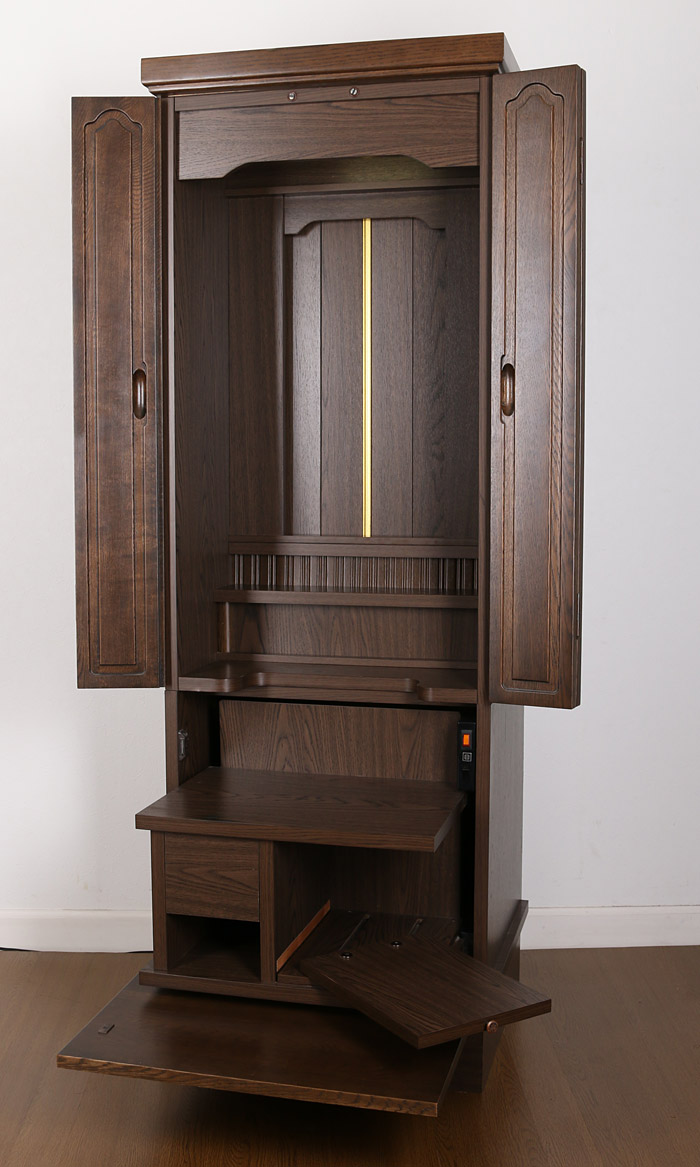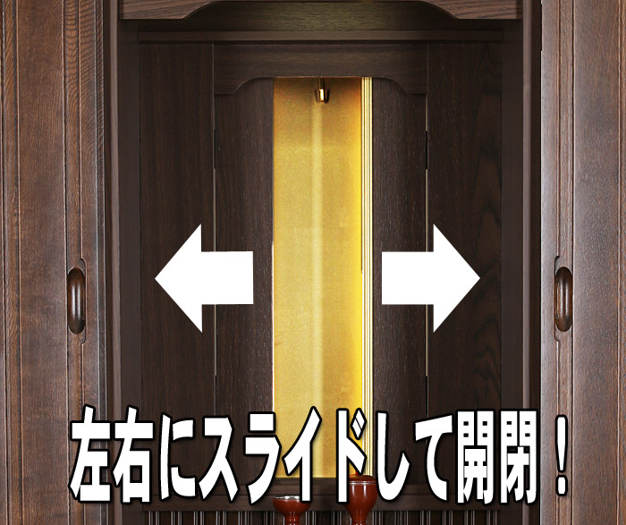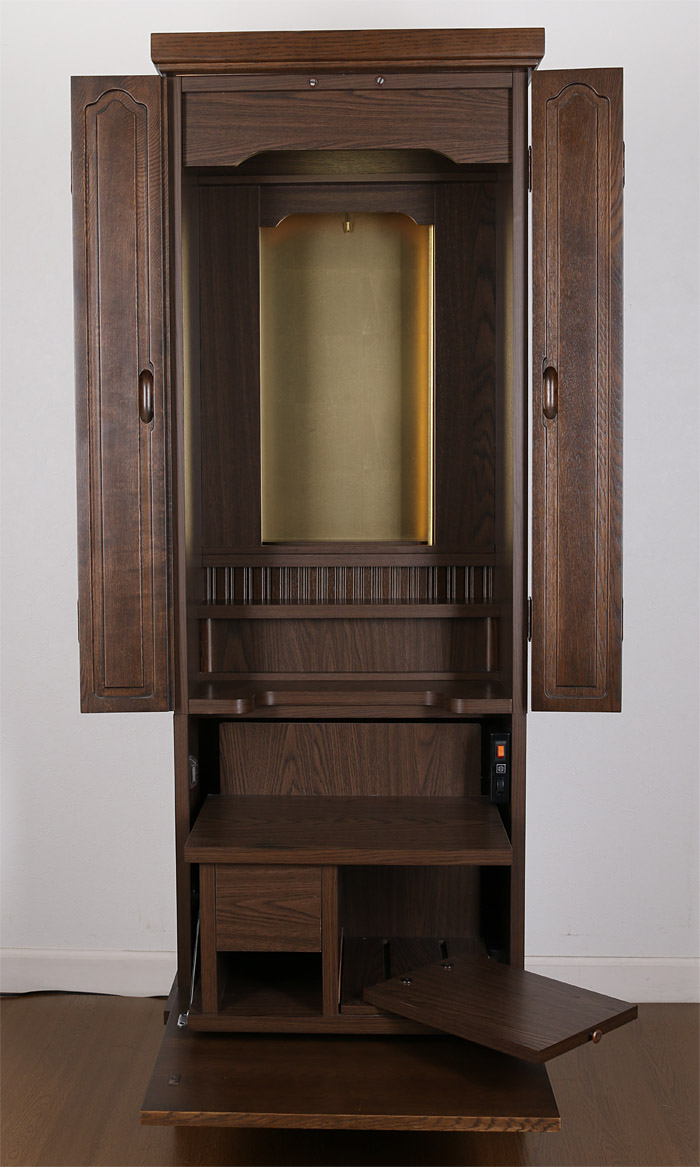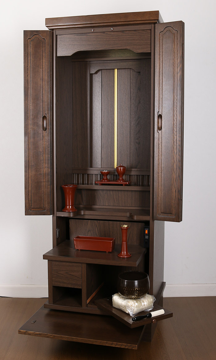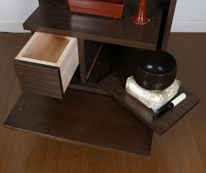 | 仕様 | ●本体寸法:高147.5×横幅52×奥行き43.5/cm ●厨子寸法:高さ50×横幅28/cm ●経 机 :幅41×奥行き29/cm ●外扉最大開幅:74~88.5/cm ●経机引出し時の奥行き:78.5/cm |