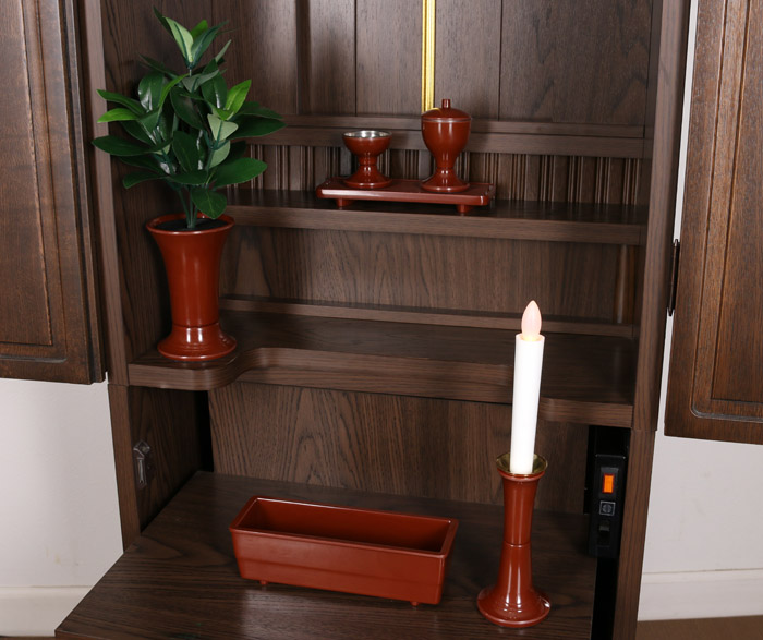 | ○スライド式電動厨子扉 ○内部照明 ○りん台収納式経机 ○創価学会会員様向けの商品 ○特装御本尊様の方はお問い合せ下さい。 |