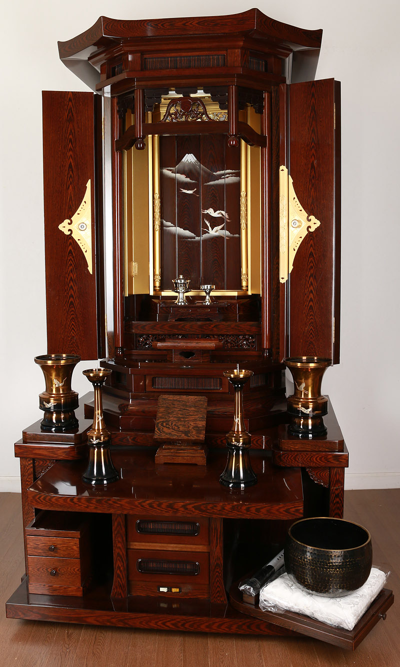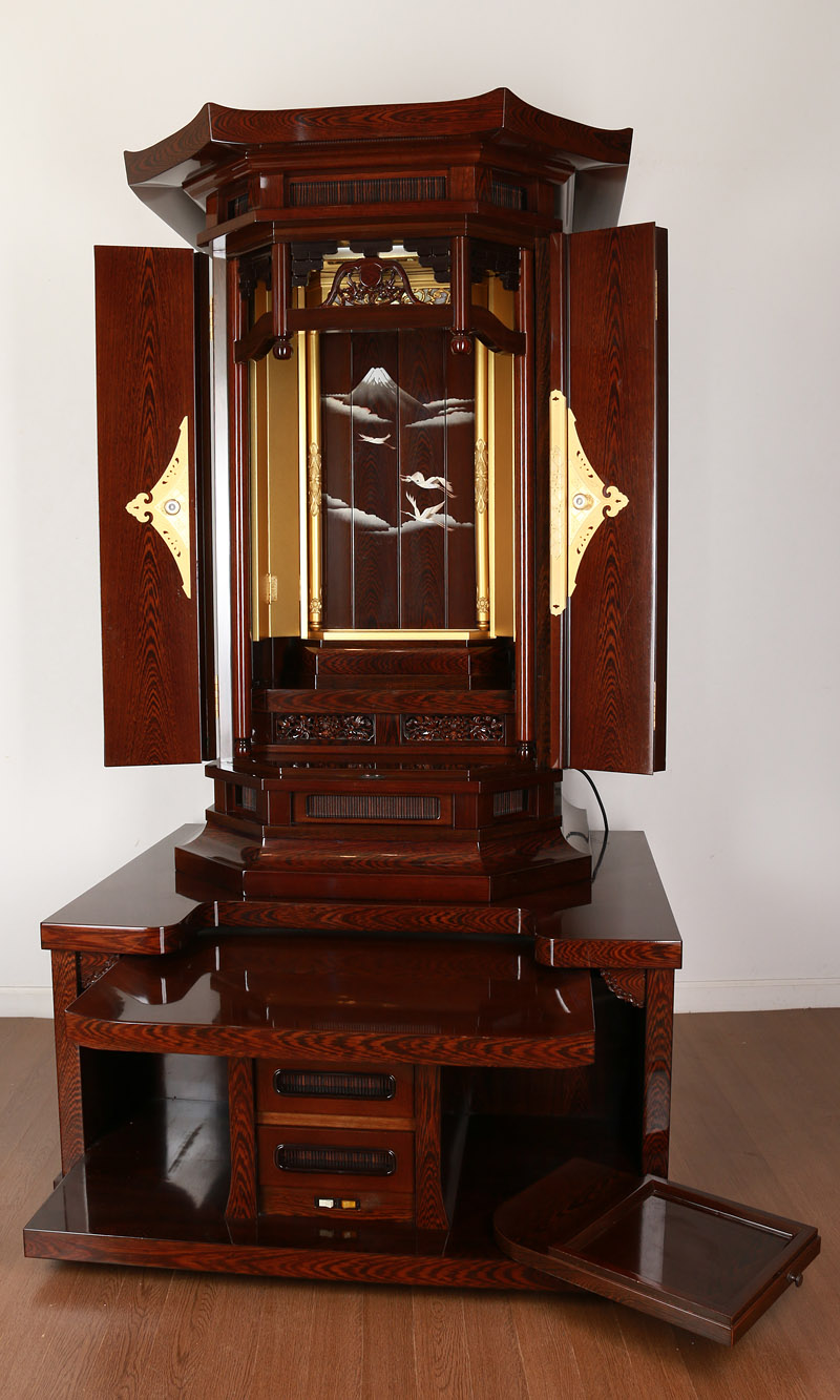 | 特徴 | 〇SGI創価学会会員様用の仏壇です。 〇経机収納型の鉄刀木製の大型伝統型厨子仏壇です。 〇厨子扉は外扉がオープンに開いた後、スライド式の扉が横開きします。 〇経机とリン台、供物台は収納式です。 〇スライド扉には伝統の駿河蒔絵が描かれています。 〇お厨子は特装(特別御形木)御本尊様に対応したワイドサイズです。 〇個人会館や拠点のお仏壇に最適 |