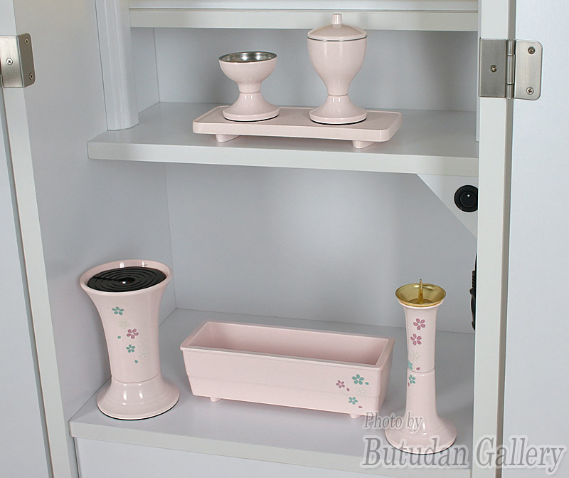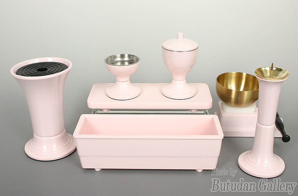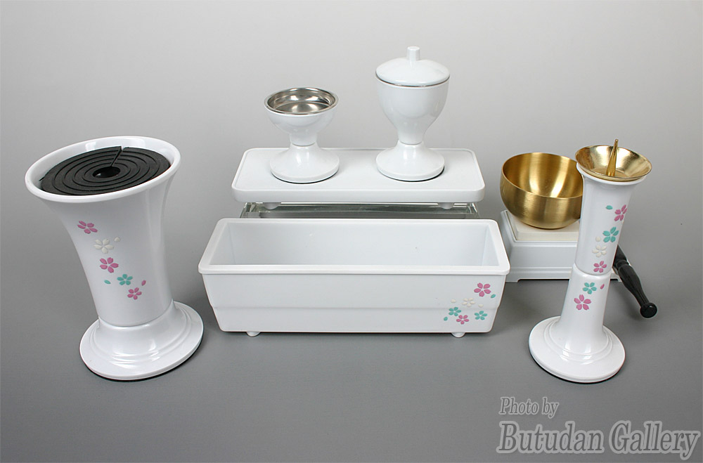 | 軽くて丈夫、使いやすい機能も満載の人気PC仏具。 | 桜の蒔絵調デザインは当店のオリジナルです。 | 灯立て・角香呂を加えた7点セット。 | ||
