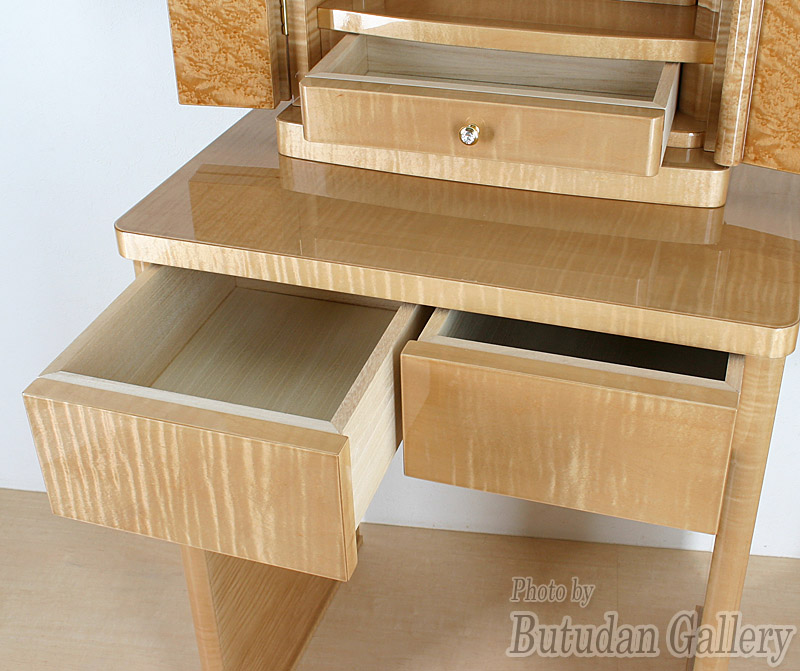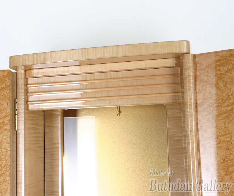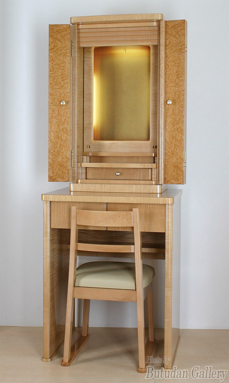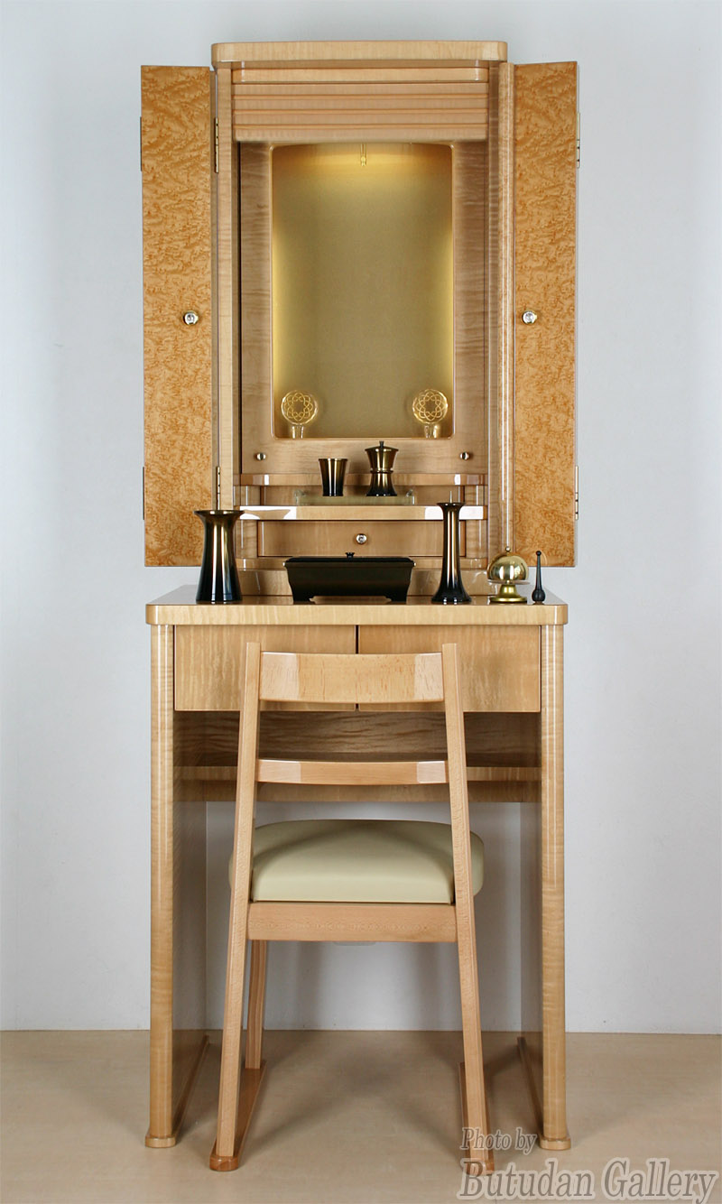 素材には、西欧の高価な家具やバイオリンなどに使用されるカーリーメープルを2種類を贅沢に配しました。優しい色合いのメープルに光沢感のある塗装を施し上品な仕上がりに。椅子にゆったりと座りながら心豊かに唱題できます。創価学会仏壇専門の仏壇ギャラリーが自信を持っておすすめする、高級素材の椅子付き家具調仏壇です。 |